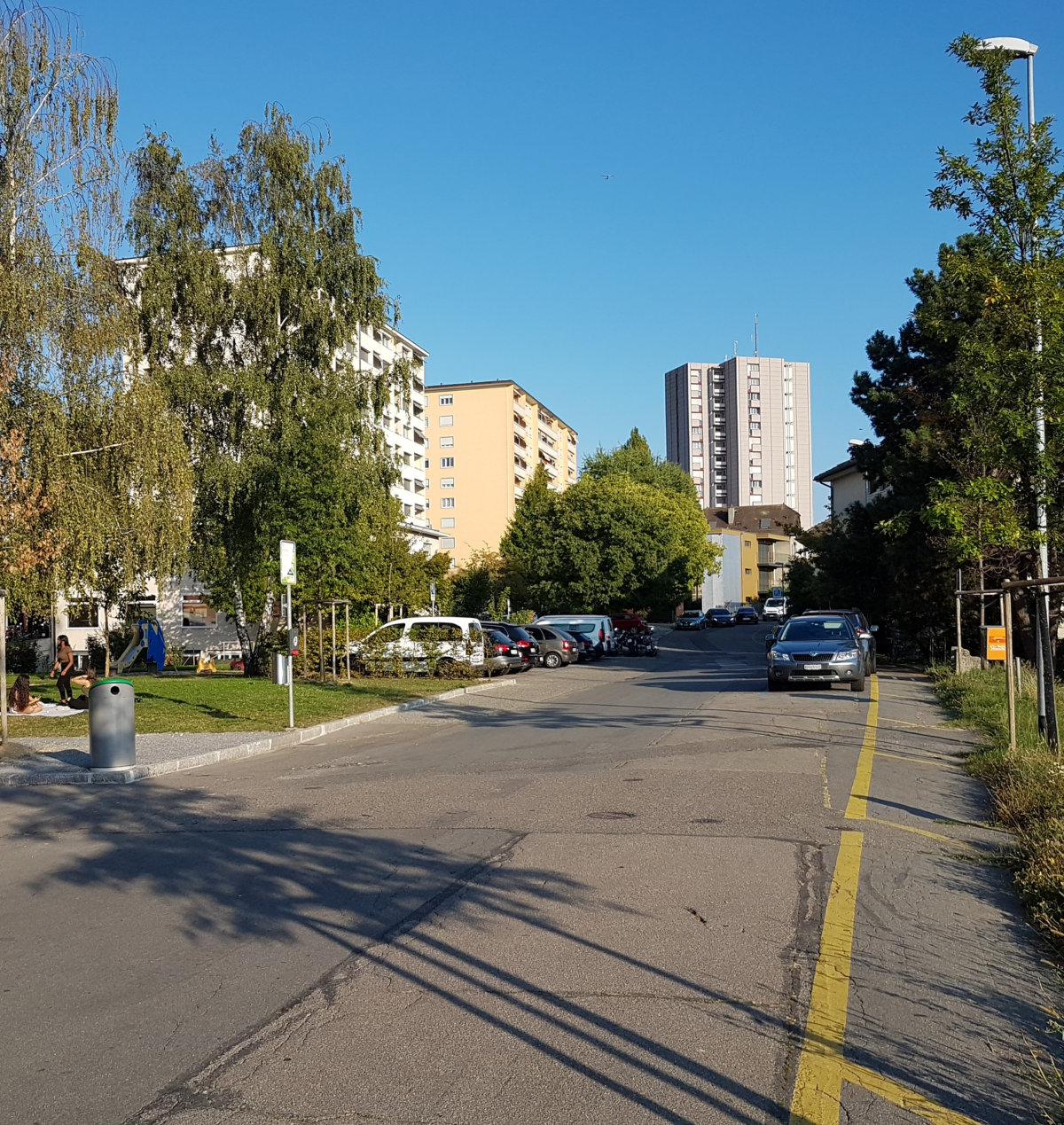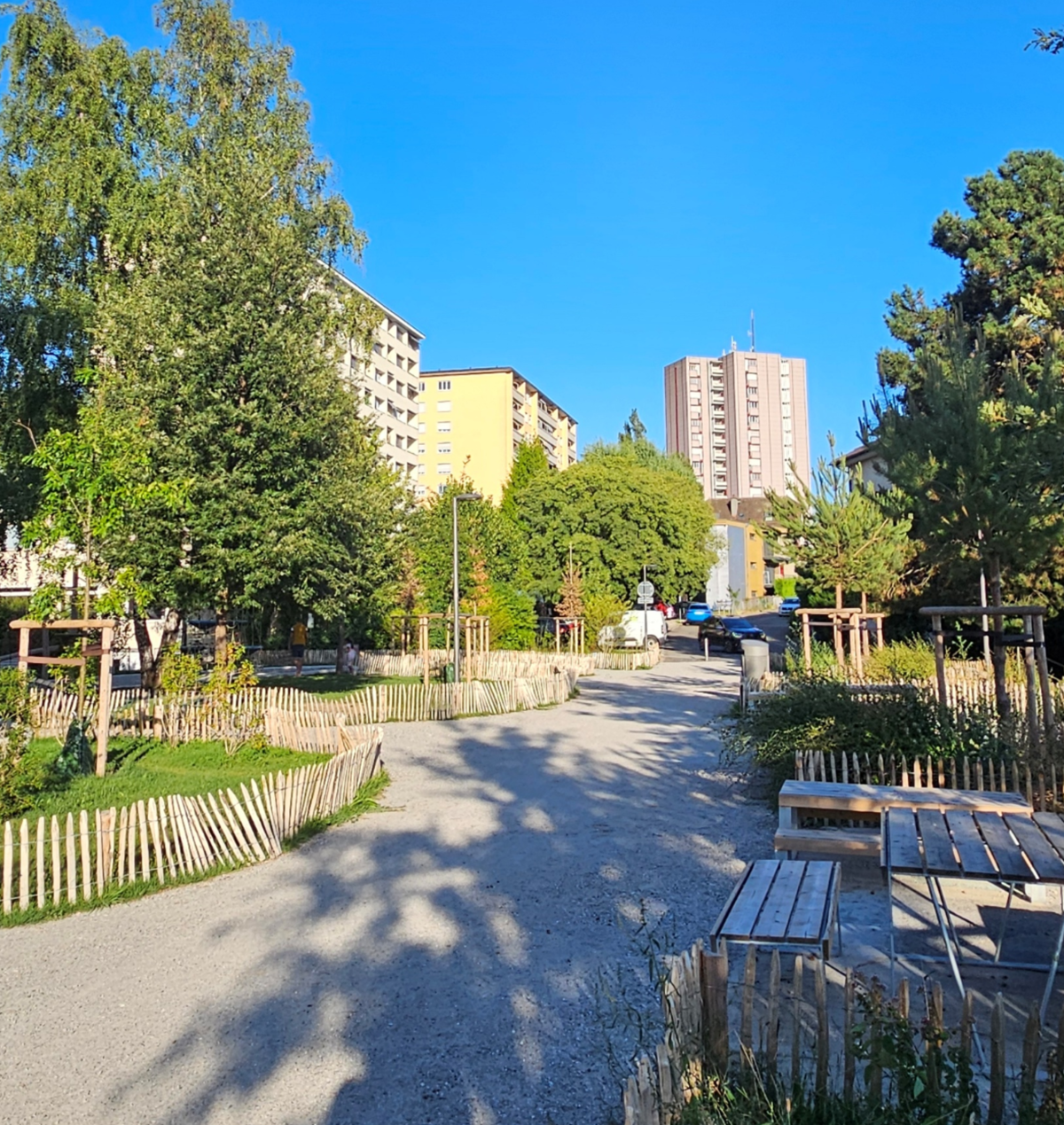Voici une comparaison avant-après du chemin des Côtes à Renens, dans le canton de Vaud. L'étude préliminaire qui a initié l'extension de ce parc sur l'emprise du domaine routier a été menée par Timothée Vincent, en tant que chef de projet chez Transitec à l'époque.